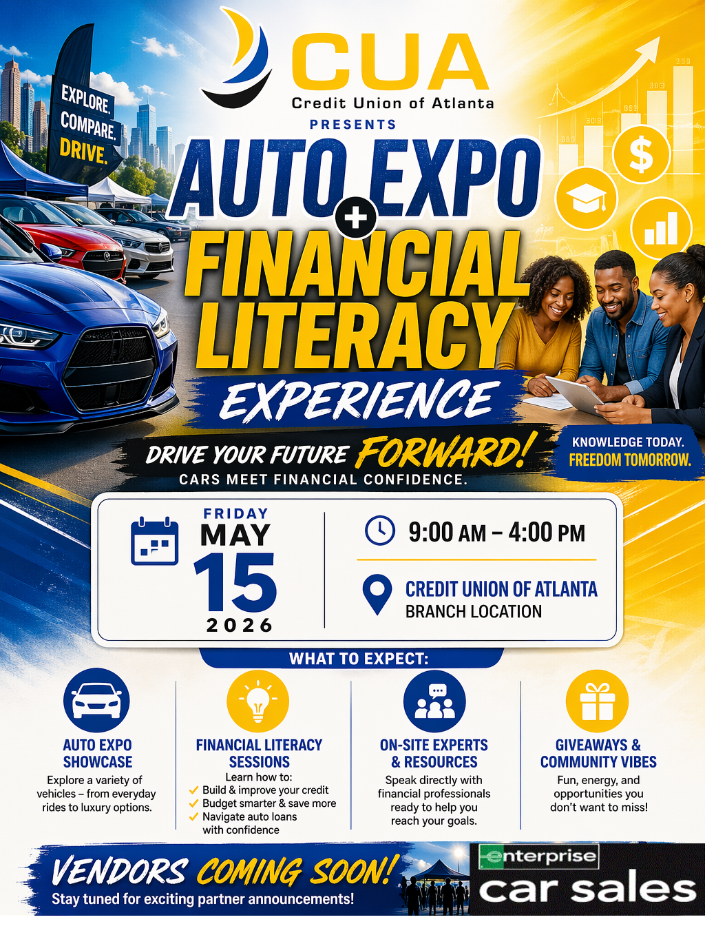 Join us at Credit Union of Atlanta on May 15, 2026 from 9 AM – 4 PM for our Auto Expo + Financial Literacy Experience! Explore a variety of vehicles, connect with trusted partners, and learn real-life money tips to help you build credit, budget smarter, and finance your next car with confidence.